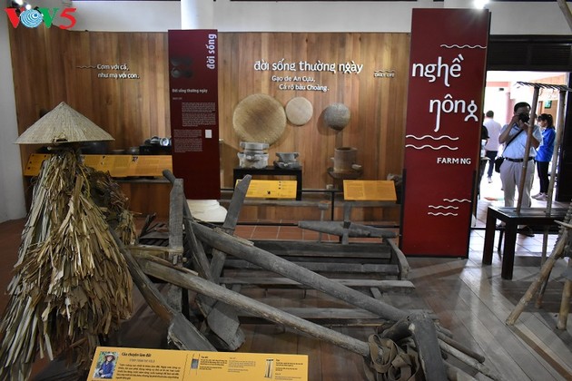 Cạnh cầu ngói là ngôi nhà trưng bày nông cụ, nơi tái hiện đầy đủ mọi hoạt động sản xuất nông như nghiệp của làng quê tại mảnh đất Cố đô. Du khách đến đây sẽ có cơ hội được tham quan nhà trưng bày để hiểu rõ hơn về cuộc sống của người dân tại đây. Ngoài ra , trong nhà trưng bày nông cụ còn có khu vực giới thiệu hàng thủ công mỹ nghệ cùng các đặc sản địa phương. Có thể kể đến như : đan lát, chằm , bánh tét
